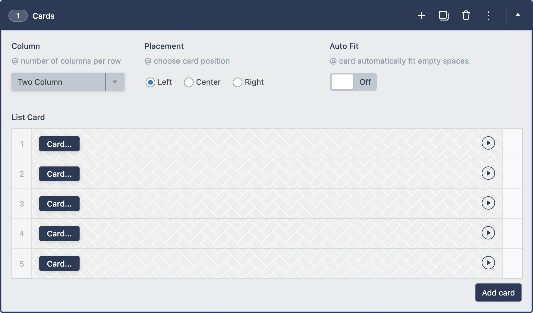 | Column | 1行あたりに表示するカード数を設定します。 最大:3カード/1行 画面サイズに応じて自動的にレスポンシブ対応します。 |
